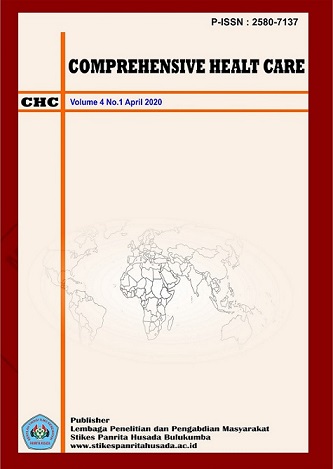 Comprehensive Health Care is the official peer-reviewed research journal of Panrita Husada High School of Health Sciences. This journal aims to promote advancement in nursing and health care through dissemination of the latest research findings. Panrita Husada High School of Health Sciences covers a wide range of nursing topics such as nursing education, clinical practice, advanced nursing issue and policy related to nursing profession. This journal publishes three issues per year April, August and December. Panrita Husada High School of Health Sciences intended readership includes nurse educator, researcher, manager, and nurse practitioner at all levels.
