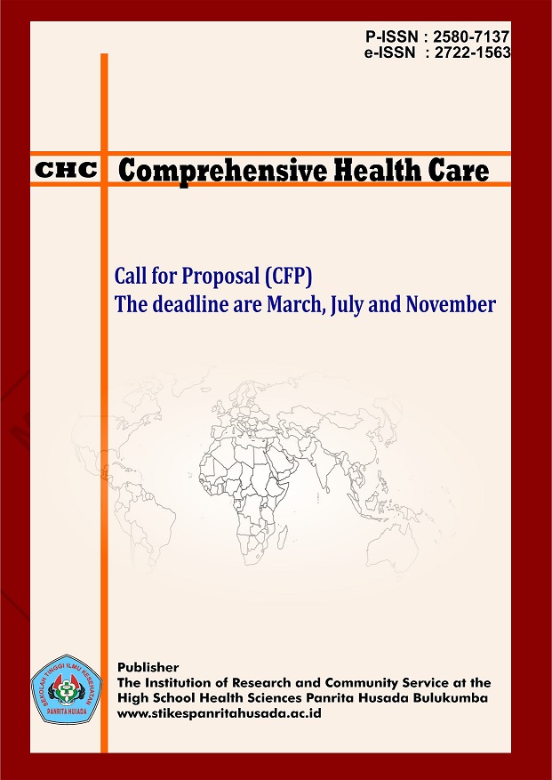 Comprehensive Health Care is the official peer-reviewed research journal of Panrita Husada High School of Health Sciences. This journal aims to promote advancement in nursing and health care through dissemination of the latest research findings. Panrita Husada High School of Health Sciences covers a wide range of nursing topics such as nursing education, clinical practice, advanced nursing issue and policy related to nursing profession. This journal publishes three issues per year April, August and December. Panrita Husada High School of Health Sciences intended readership includes nurse educator, researcher, manager, and nurse practitioner at all levels.